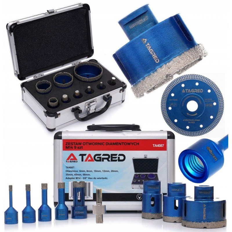 Кільцеві алмазні коронки TAGRED TA4087 - самоохолоджувальні та ефективні алмазні свердла для дрилів та кутових шліфувальних машин дозволяють виконувати чисте свердління всіх типів плитки без використання водяного охолодження. Професійні алмазні коронки були встановлені з використанням технології вакуумного паяння. Їх цінують за швидкість свердління дуже жорстких матеріалів. Бічні отвори для пилки прискорюють свердління та видалення матеріалу.
