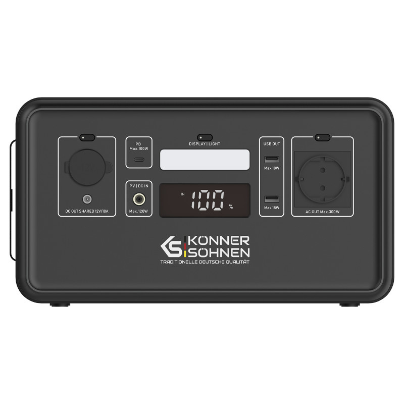 Мобільна портативна електростанція KS 500PS німецької торгової марки Könner & Söhnen виготовляється з використанням високоякісних LifePO4 літій-залізо-фосфатних акумуляторів високої ємності, які мають більш високу енергетичну щільність в порівняні з Li-ion, вони можуть зберігати більше енергії в компактному форматі та мають великий життєвий цикл – 4000 циклів заряд-розряд. Вона стане надійним помічником для зарядки пристроїв в дорозі або в разі збоїв електропостачання. Її потужності буде достатньо для роботи такої техніки як смартфон, цифрова камера, планшет, дрон, міні-холодильник, насос для накачування, вентилятор. Вона працює тихо, тому дозволить живити електричні пристрої та насолоджуватись часом без будь-якого заважаючого шуму.