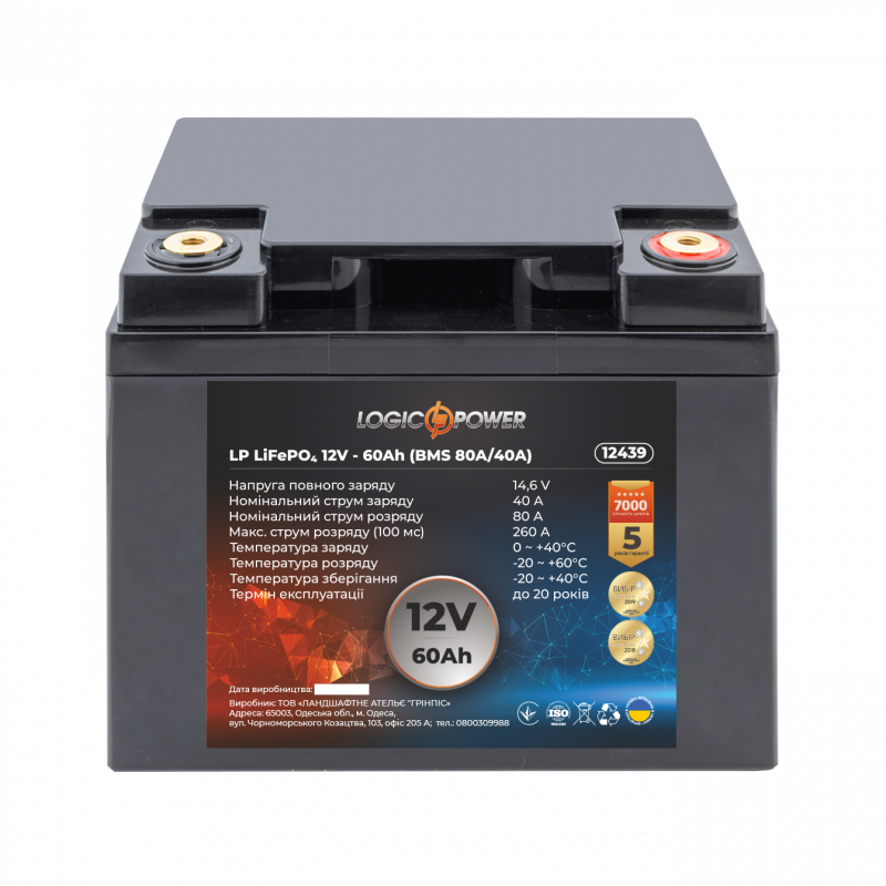 Акумулятор LP LiFePO4 12V (12,8V) - 60 Ah (768Wh) (BMS 80A/40А) пластик - купити